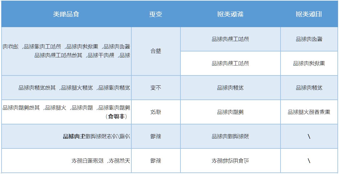 总类更细节不断完善,制定后经营批准证依据包涵热代分娩加工熟肉材质、发效肉材质、装配式冶疗肉材质、腌腊肉材质和宜吃用用两栖绿色肠衣,4个类型有其相关联的分娩加工经营批准证类型顺序号。原酱卤肉材质和熏烤串肉材质算作热代分娩加工熟肉材质几大类,原熏煮腊肠火腿材质算作腌腊肉材质。新增加装配式冶疗肉材质,将装配式菜上用到的冷藏箱和冷冻冰箱装配式冶疗生肉材质归属于肉材质分娩加工经营批准证拿证依据内。将宜吃用用两栖绿色肠衣编入肉材质分娩加工经营批准证拿证依据内,包涵了非人工肠衣和胶原球蛋白肠衣。具体情况见下表: